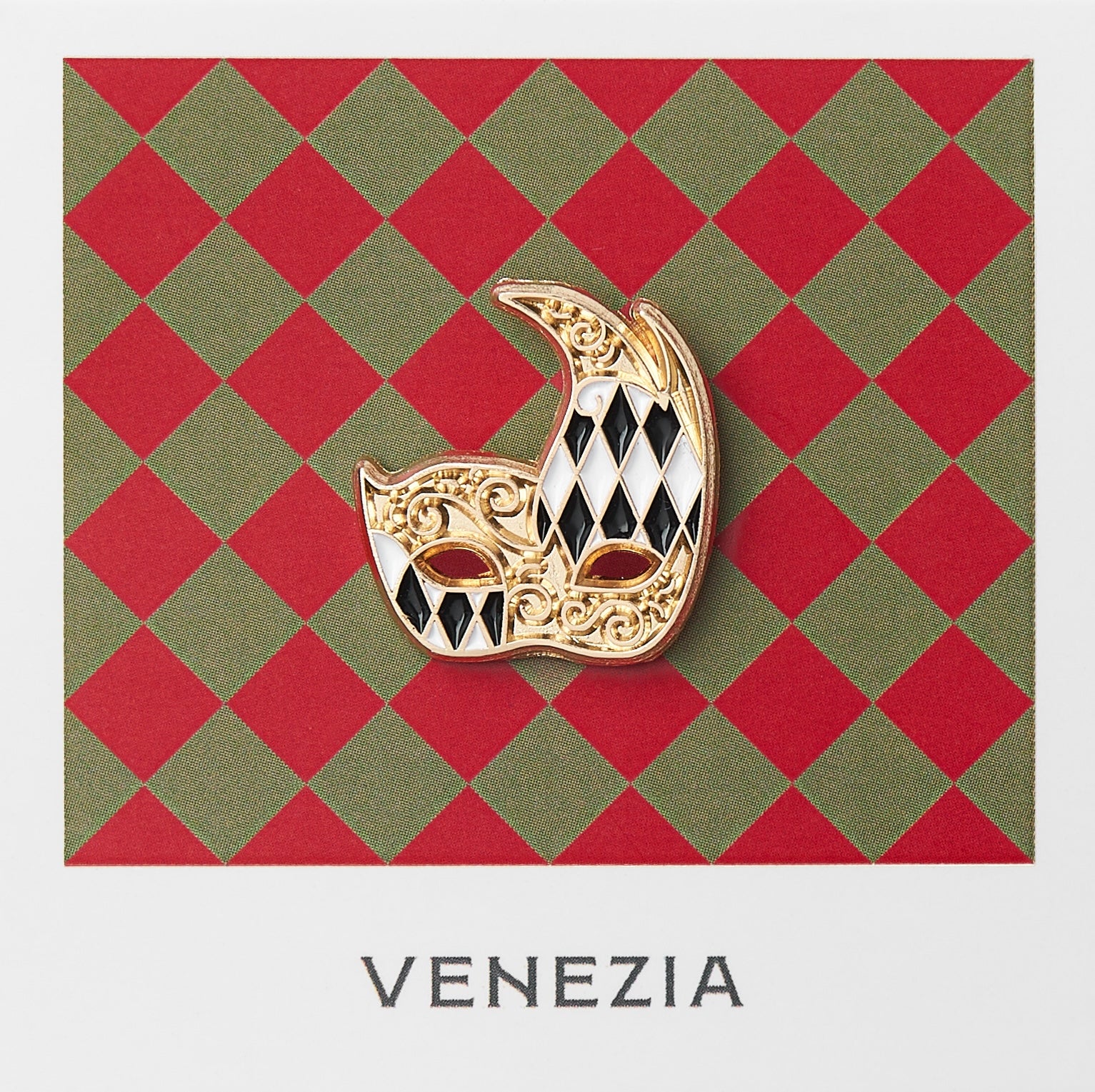 An emblem of elegance and grace. Metal pin of the Colombina mask, a symbol of beauty from Venice’s Carnival traditions.