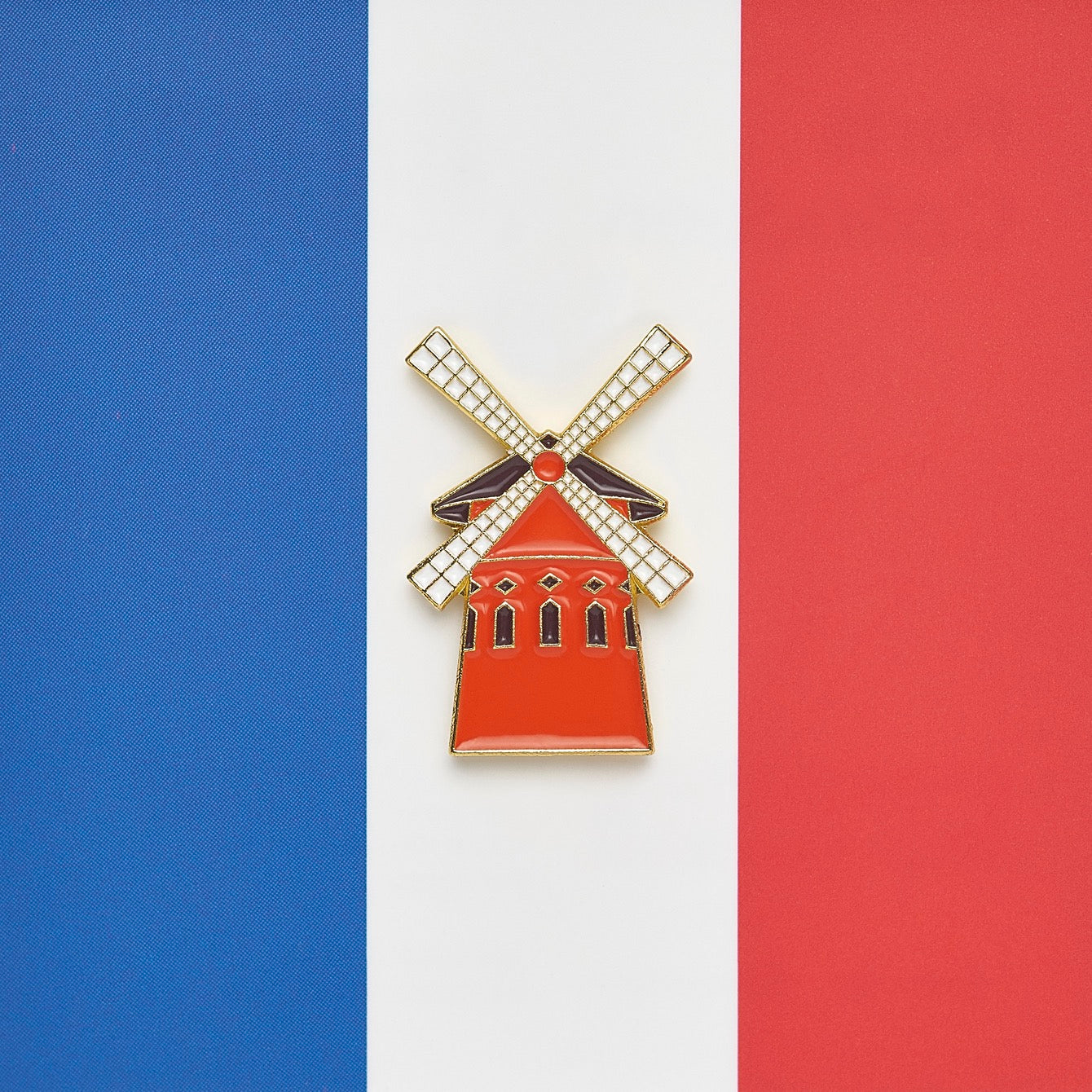 Lights, camera, cabaret! Metal pin in the shape of the iconic Moulin Rouge windmill, celebrating Parisian nightlife.