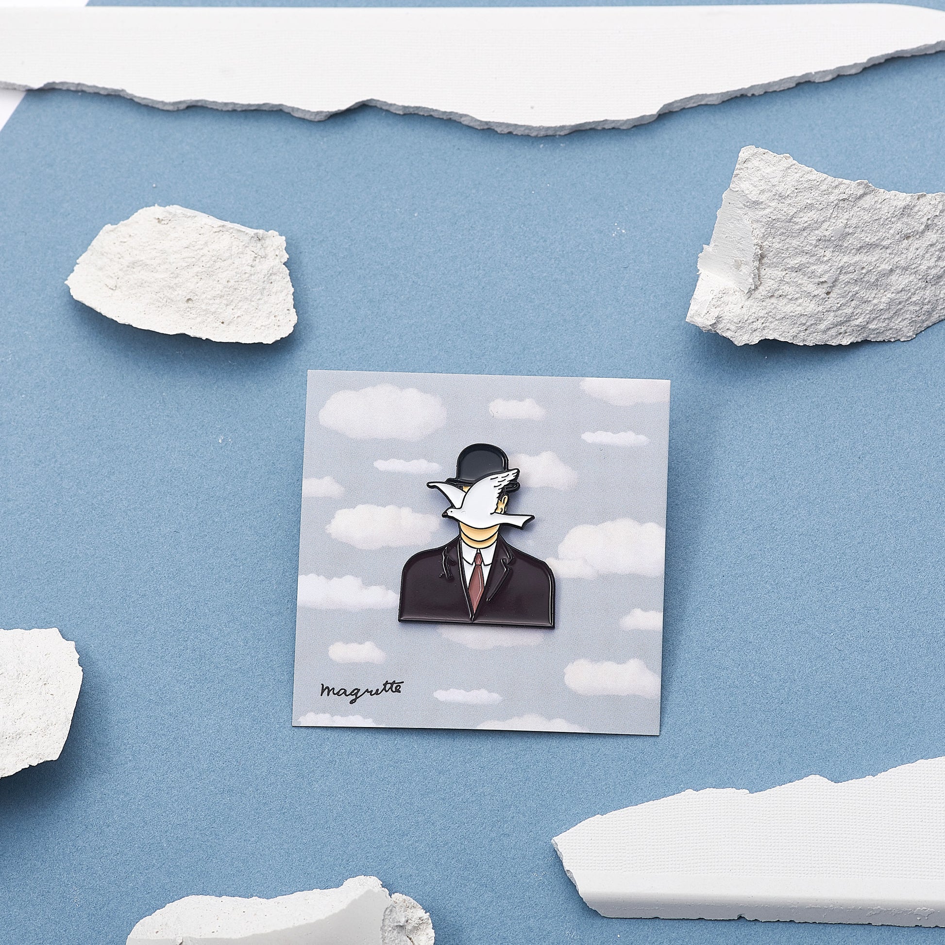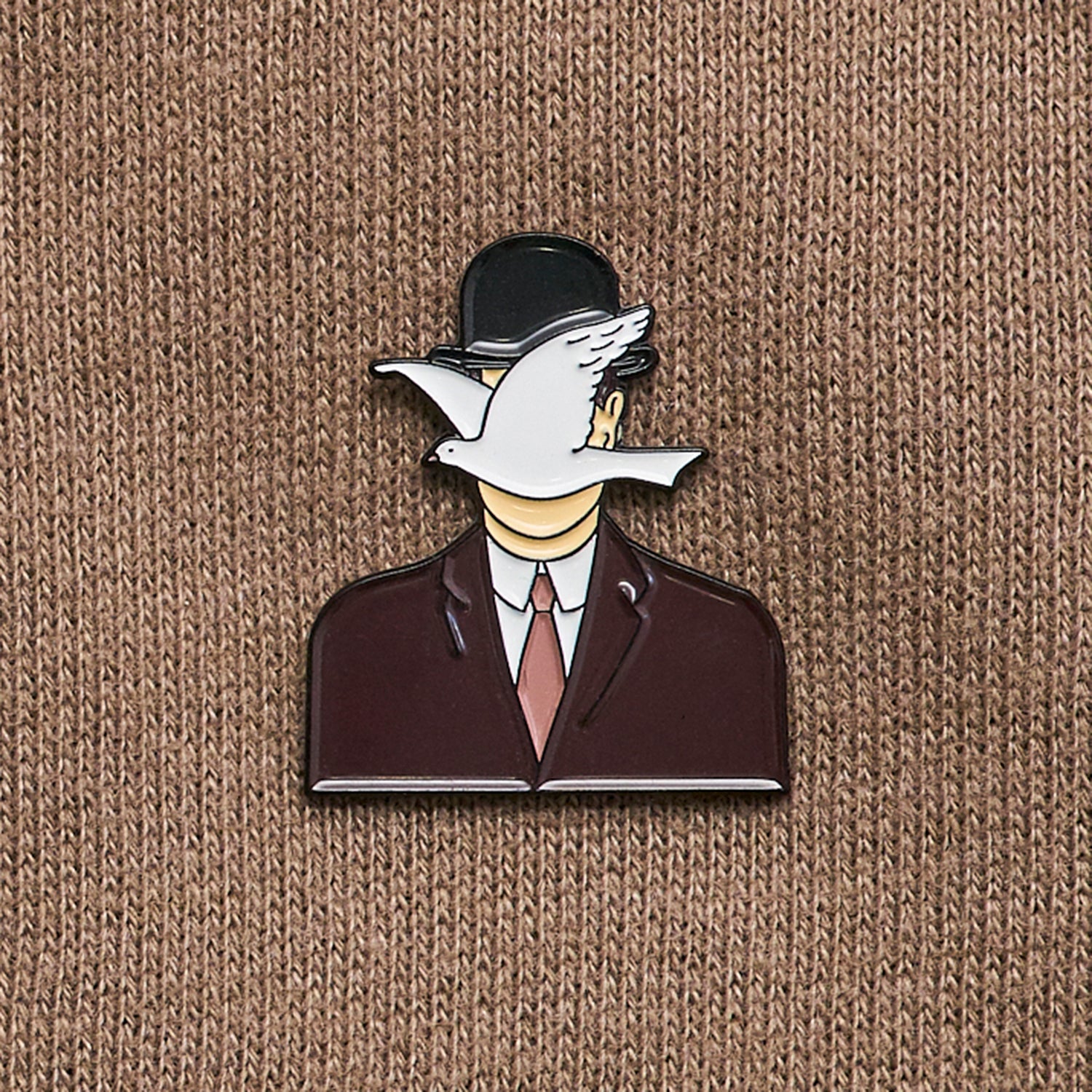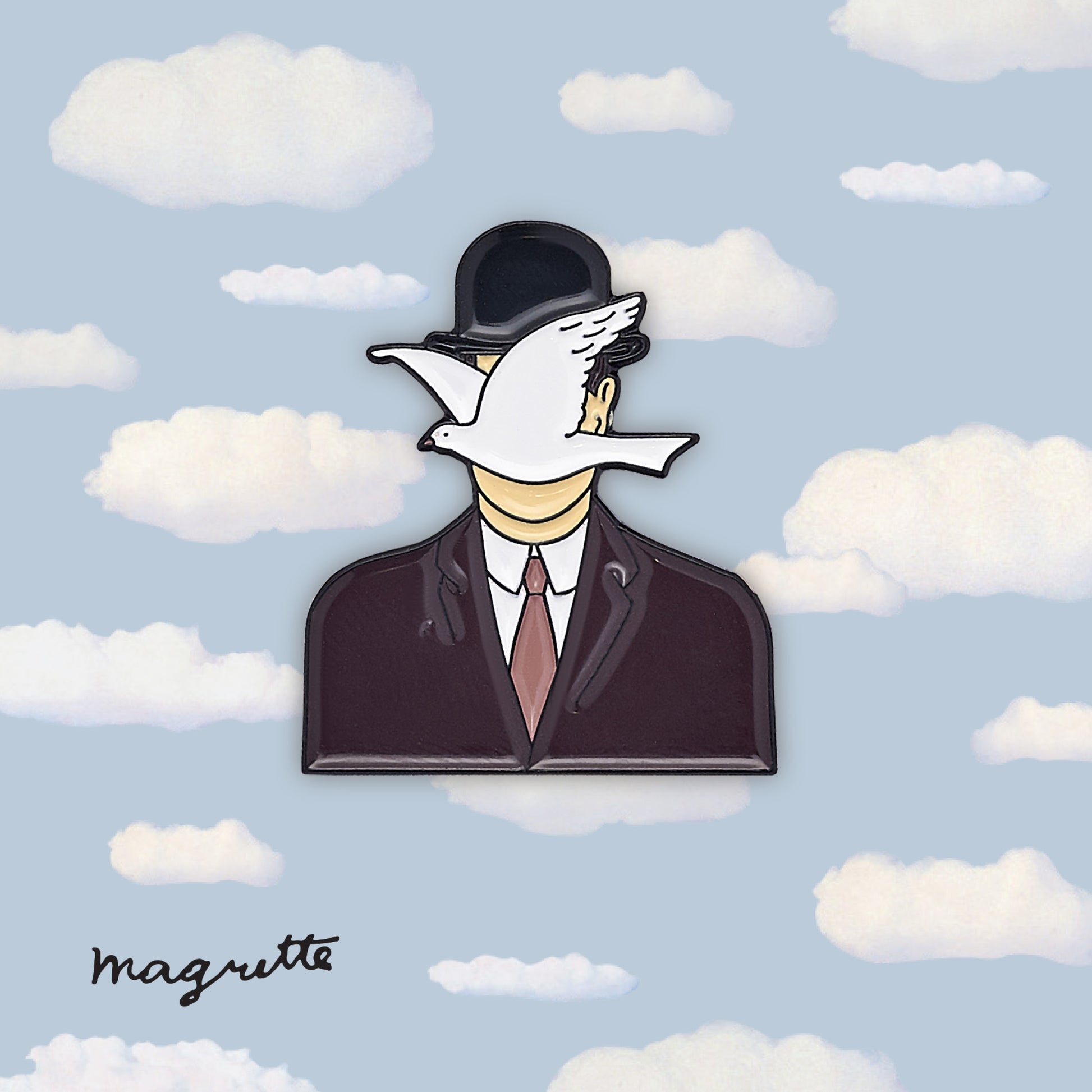 Magritte’s iconic figure! Metal pin inspired by L'homme au chapeau Melon, 1964, a symbol of surrealist identity and mystery.