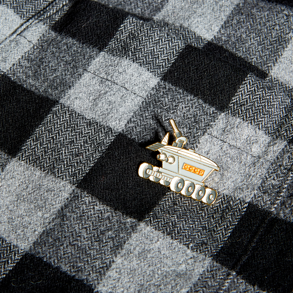 Pshkkk. Over-over. Metal pin in the shape of a moon walker.