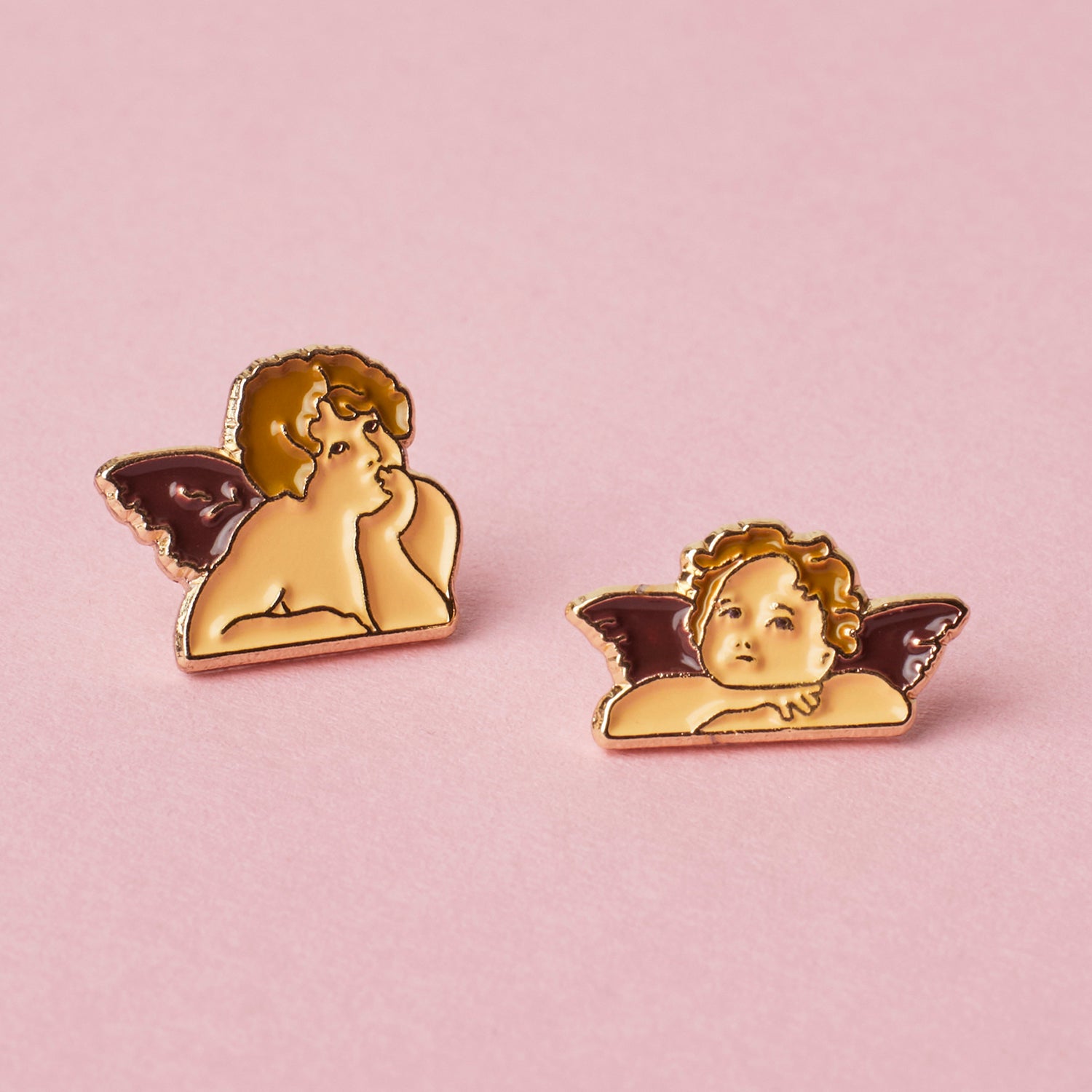 Divine inspiration in miniature form. Set of two metal pins replicating Raphael's The Sistine Madonna, 1512–1513.