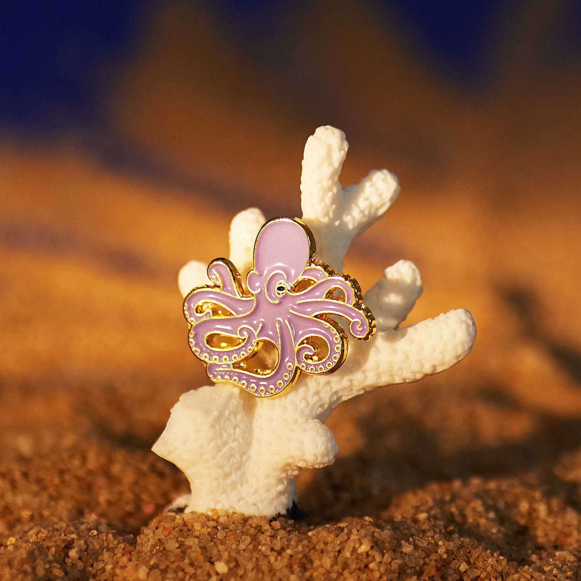 A clever and curious sea dweller. Metal pin in the shape of an octopus.
