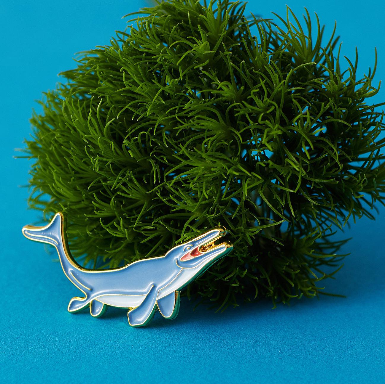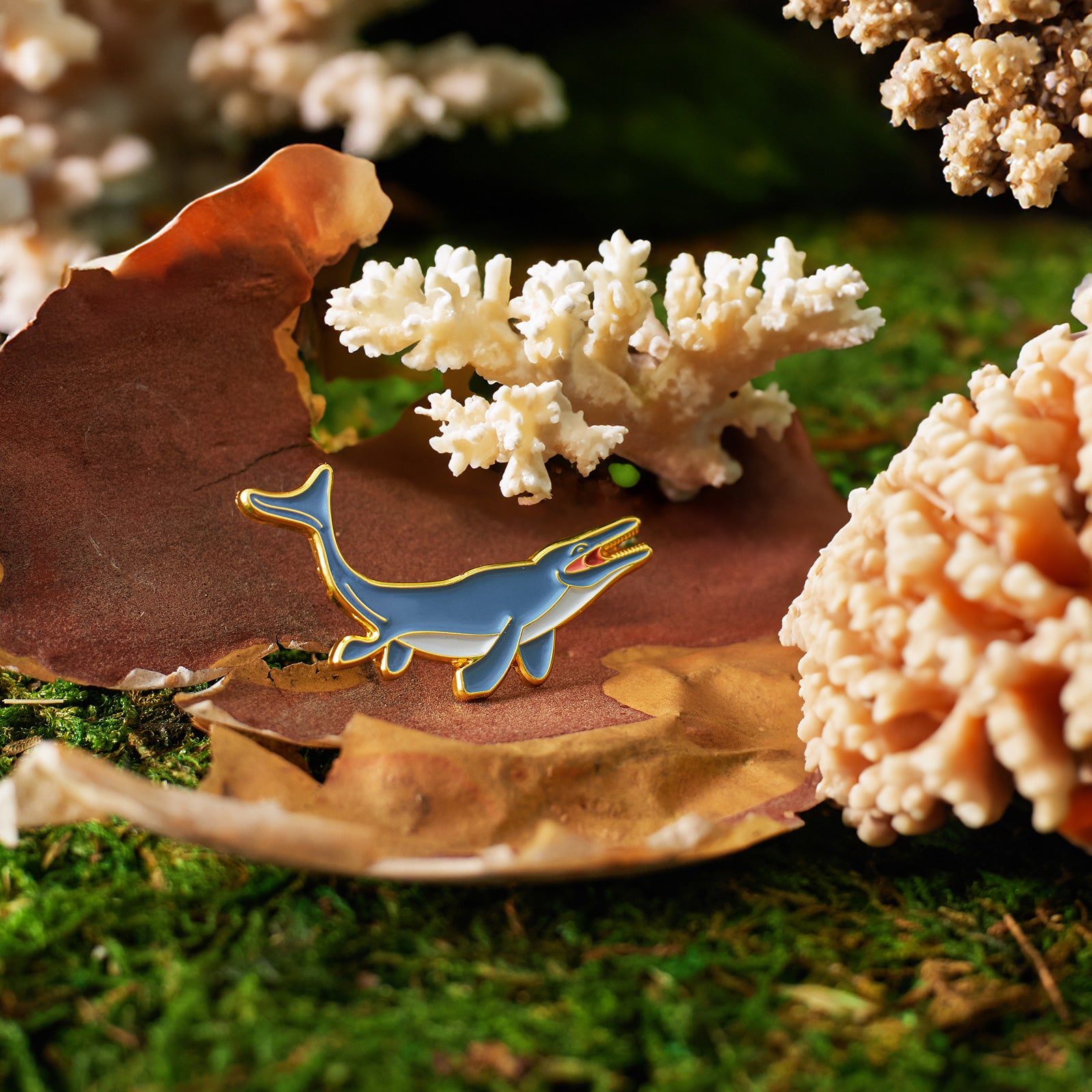 A sleek design inspired by oceanic hunters. A metal pin depicting the powerful Mosasaurus of the deep seas.