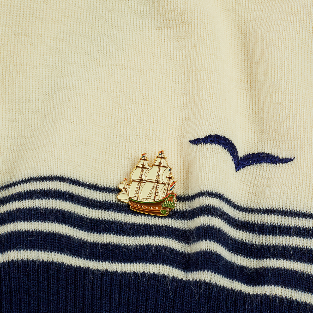 Exceptional in sea navigation since forever. Metal pin in the shape of a cargo ship.
