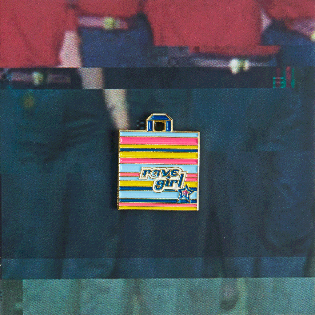 Off to the store and the change to mom! Metal pin from the 90ies series with the plastic bag "Rave Girl".