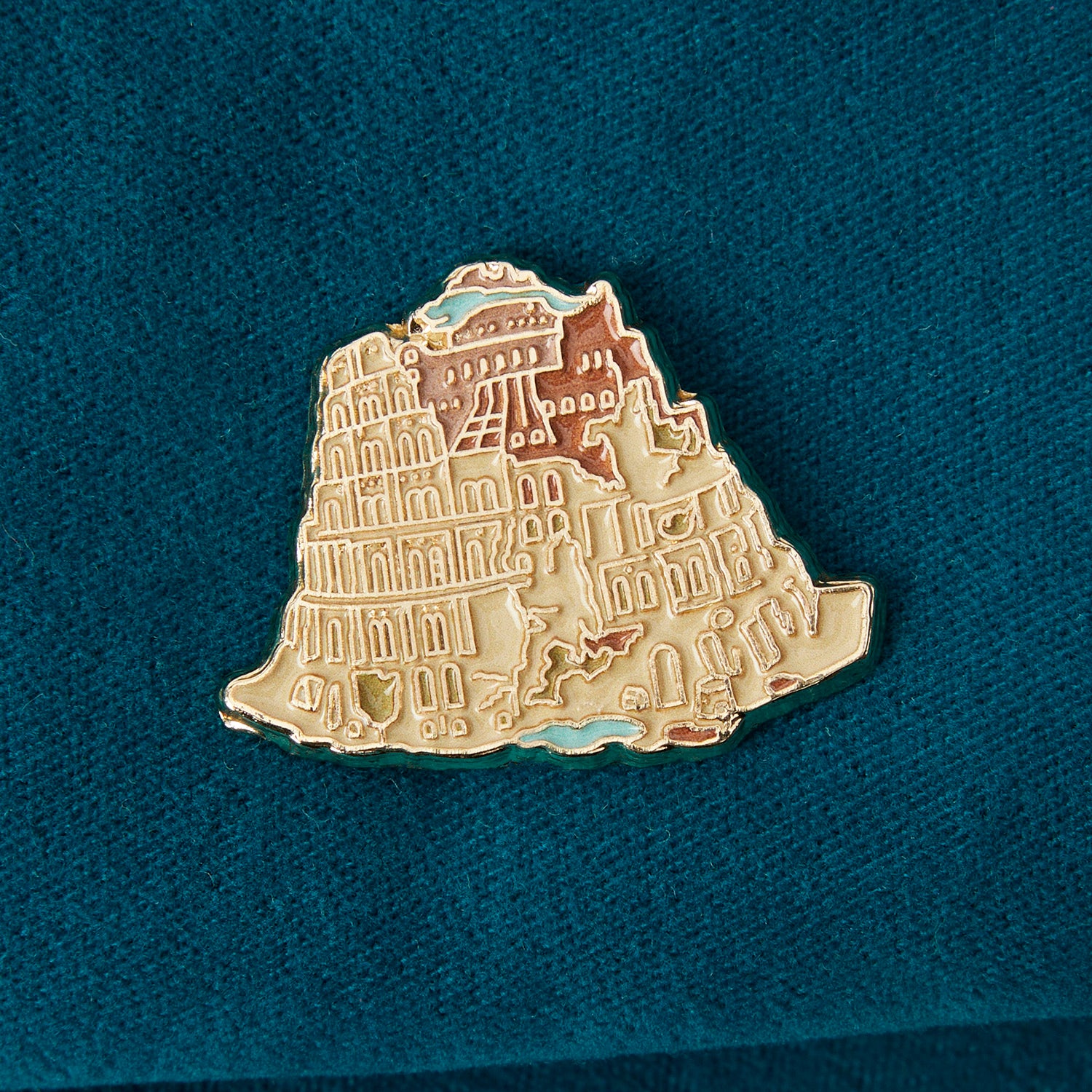 A story of ambition and grandeur. Metal pin inspired by Pieter Bruegel’s The Elder Tower of Babel, 1563.