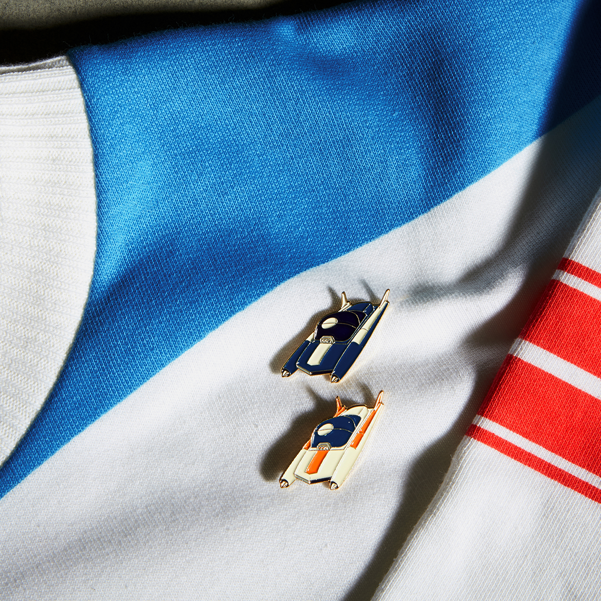Stylishly grooving through the universe. Metal pin in the shape of a space car.